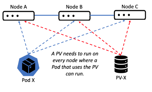 It’s helpful to think about how a simple three-node Kubernetes cluster operates to understand what is expected of a PV. Kubernetes containers run in Pods. During normal operations, Pod X running on Node A might stop and be restarted on Node C or Node B, so any PV it’s associated with (PV-X in the diagram below) will need to be accessible from every node where the Pod can run. Often that means it will need to be accessible on all nodes in the cluster. And, of course, you need to have methods to create PVs and a way for application containers running in pods to consume them.