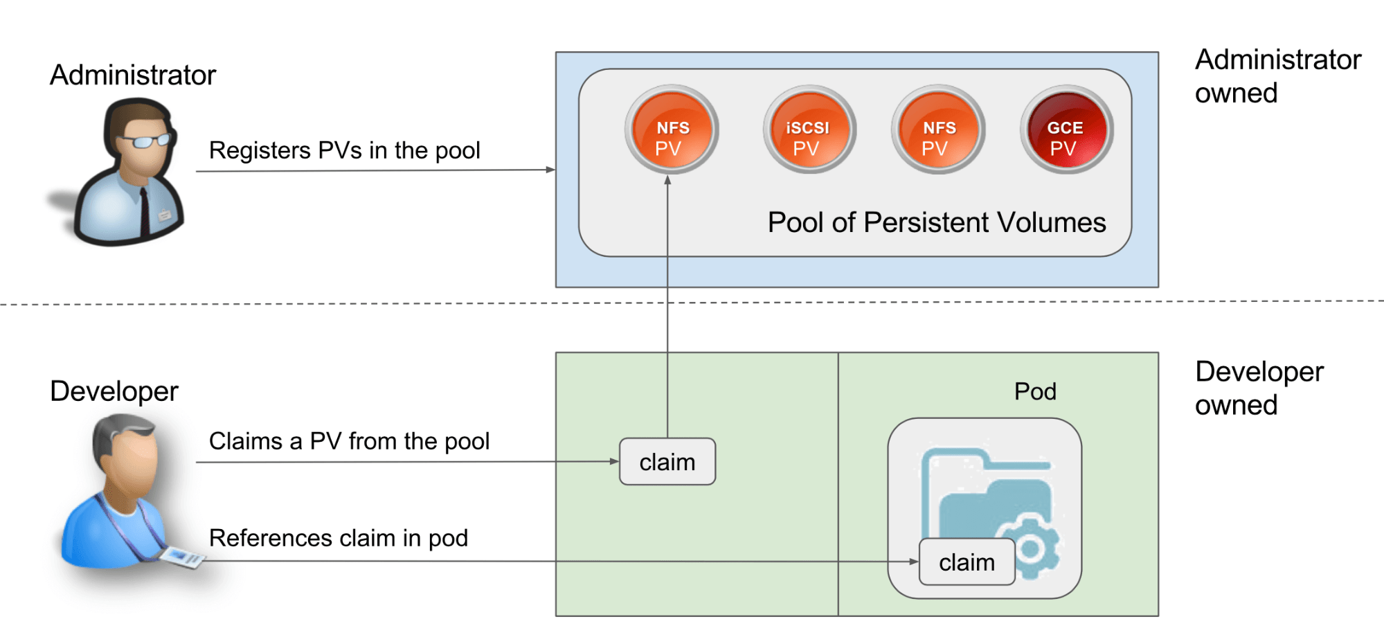 • Developer configures a Pod to use the PV based on the satisfied claim.