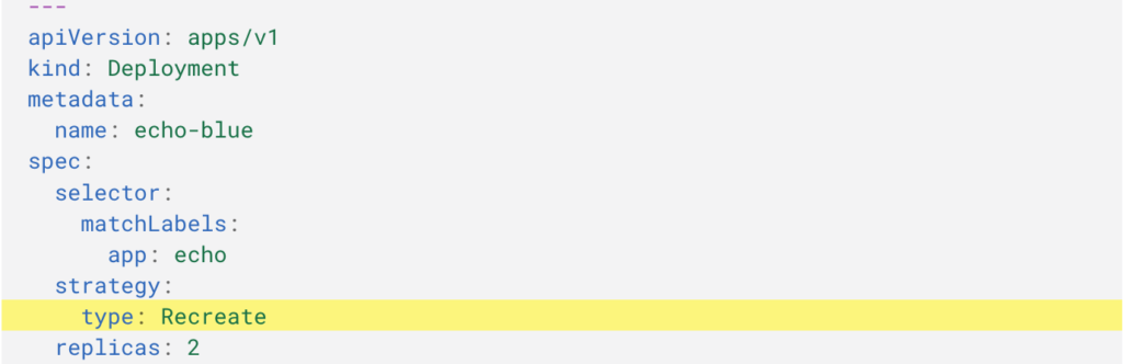 You can control how the deployment of your application on Kubernetes is performed simply by setting the strategy for the Deployment as illustrated in the following code fragment: