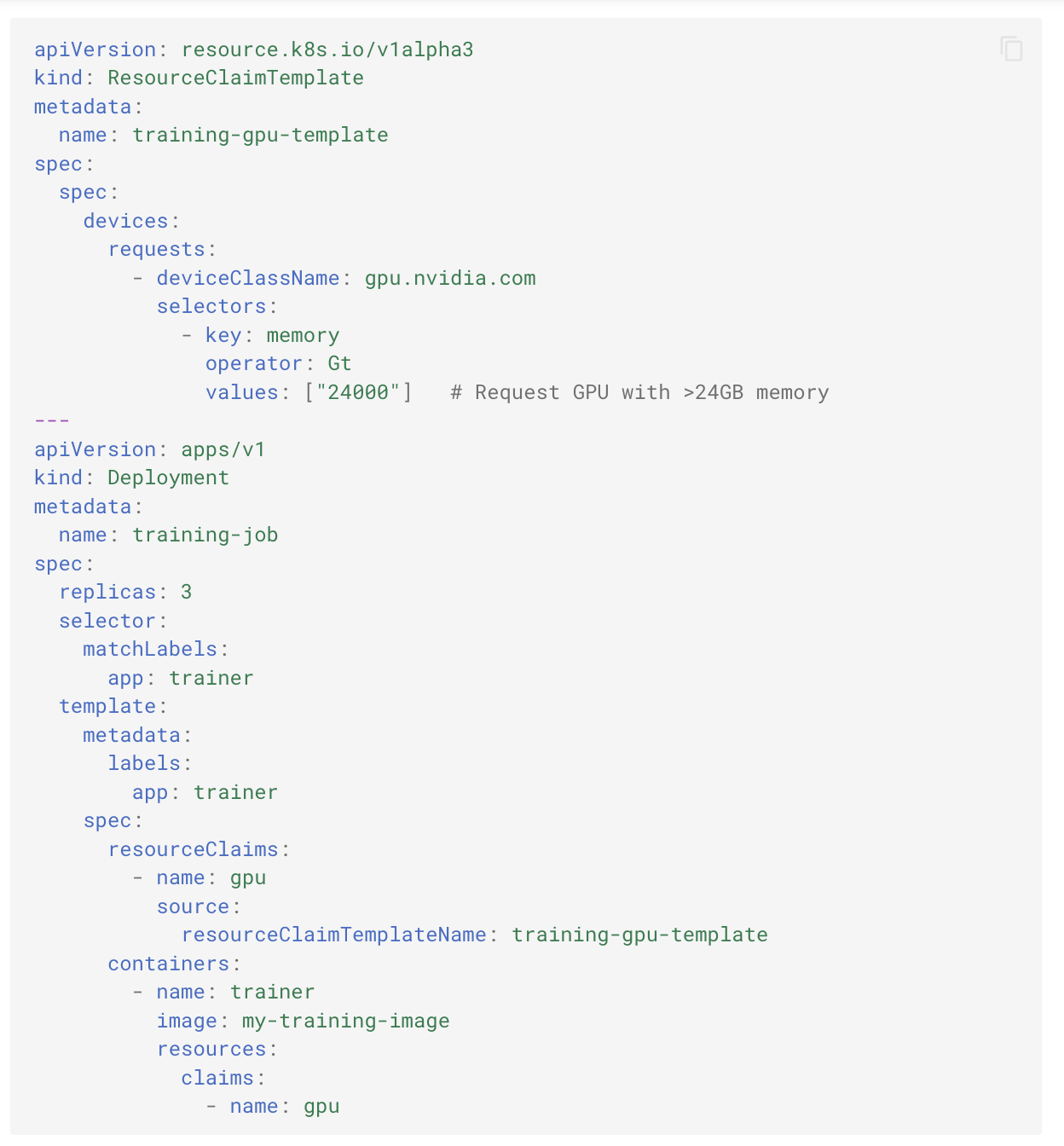 • Use ResourceClaimTemplate when each Pod needs its own device (e.g., distributed training).