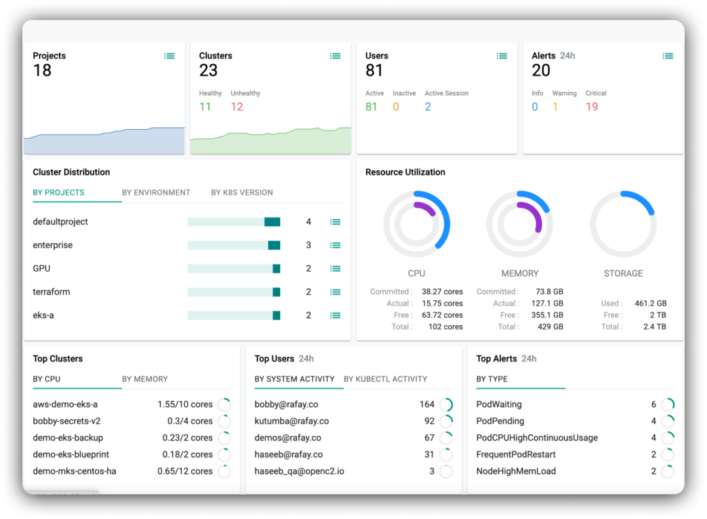 Rafay delivers a comprehensive view of the health of your Kubernetes infrastructure and modern applications across data centers, public cloud and remote / edge locations. WIth Rafay, enterprise teams remediate and resolve issues faster by: