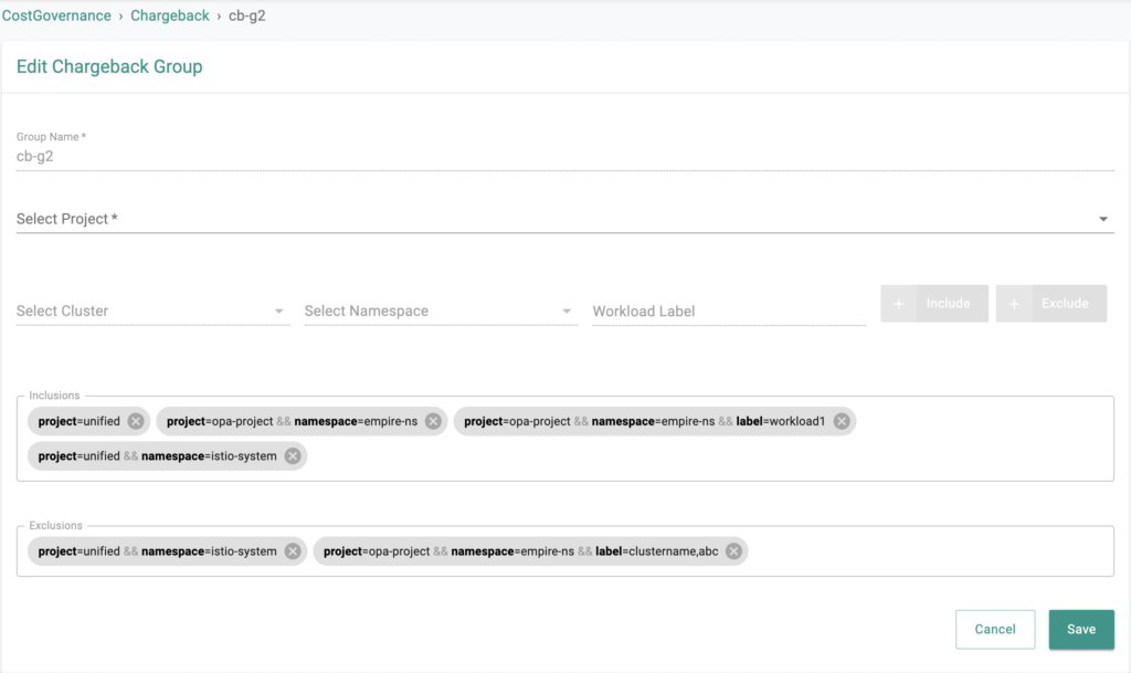 Chargeback or showback groups (shown below) aid with combining various resources into a logical group and track their costs. This capability provides flexibility to define groups based on projects, clusters, namespaces or workload labels. You can select a desired time interval generate a cost report for the chargeback group anytime you want.