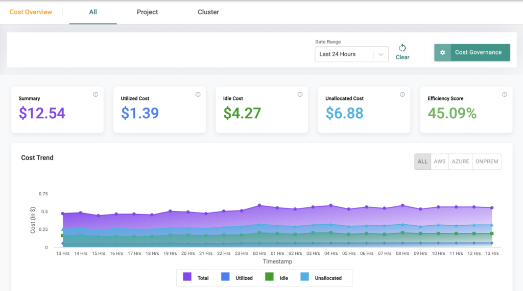 The Cost Overview dashboard shows a comprehensive view of actual costs. It is possible to view these costs for your entire fleet or just a cluster, a single namespace or a project. The flexible time scale and cloud vendor dimensions lets you deep dive into the costs to the most granular level. The efficiency score, which is the ratio of your spend on allocated resources and leased resources, helps you evaluate and right size your kubernetes clusters with a single percentage number.