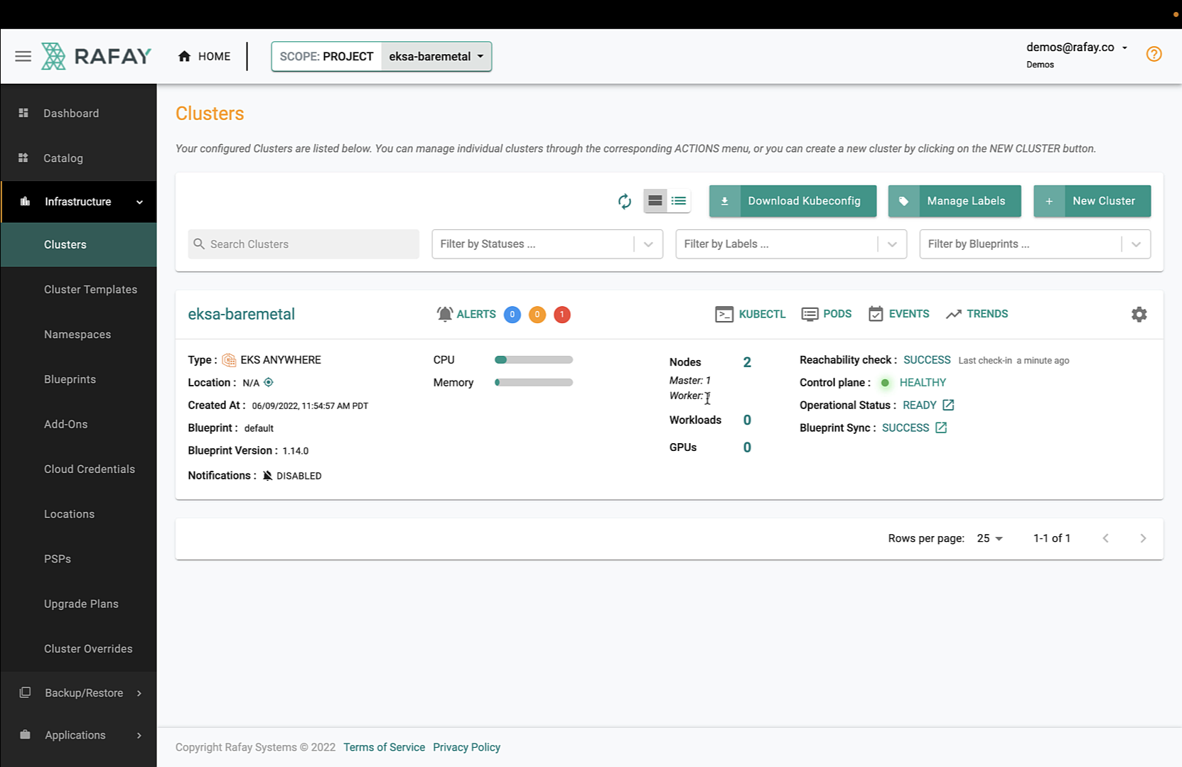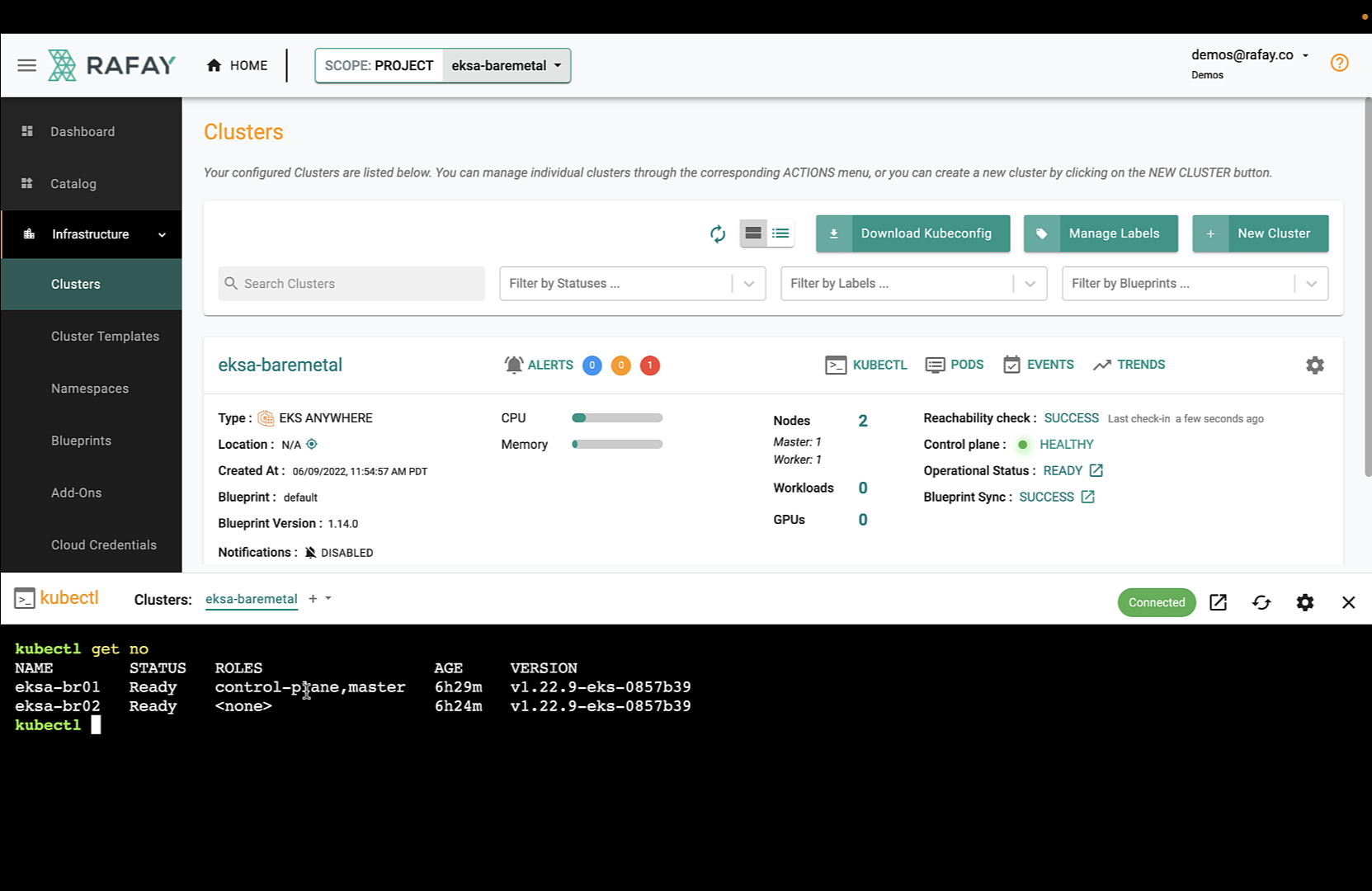 Watch a video of Rafay Kubernetes Operations Platform managing an EKS Anywhere Bare Metal cluster in a data center.