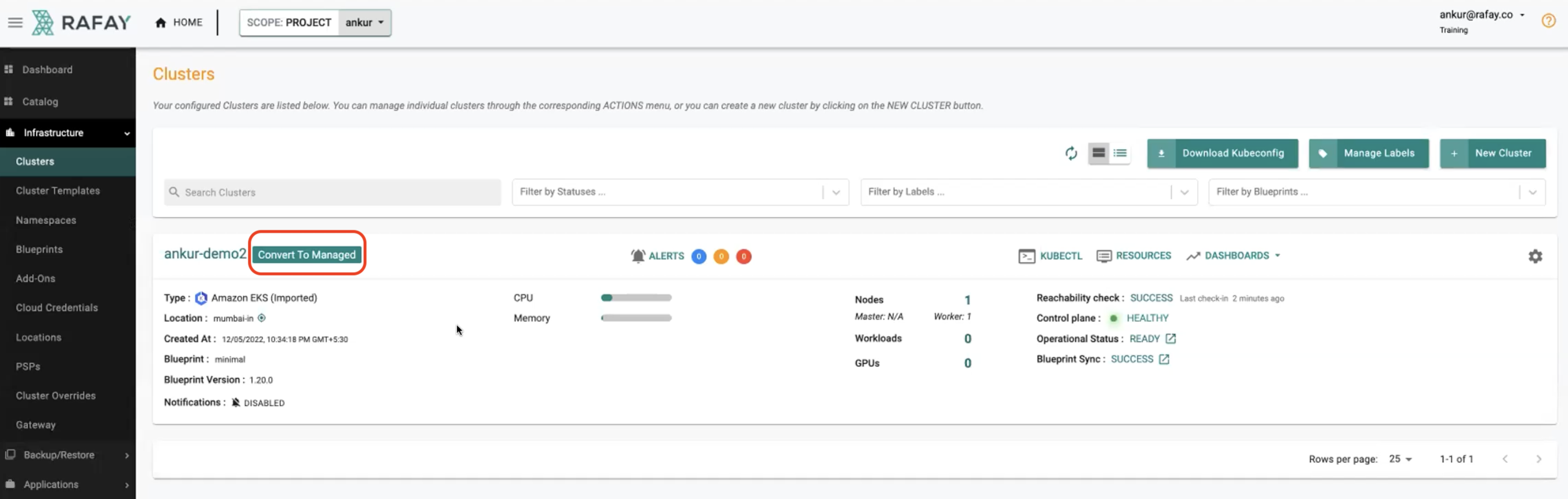 As they start using the platform, they naturally stumble onto the “Convert to Managed” option next to their imported EKS clusters and learn about this capability.