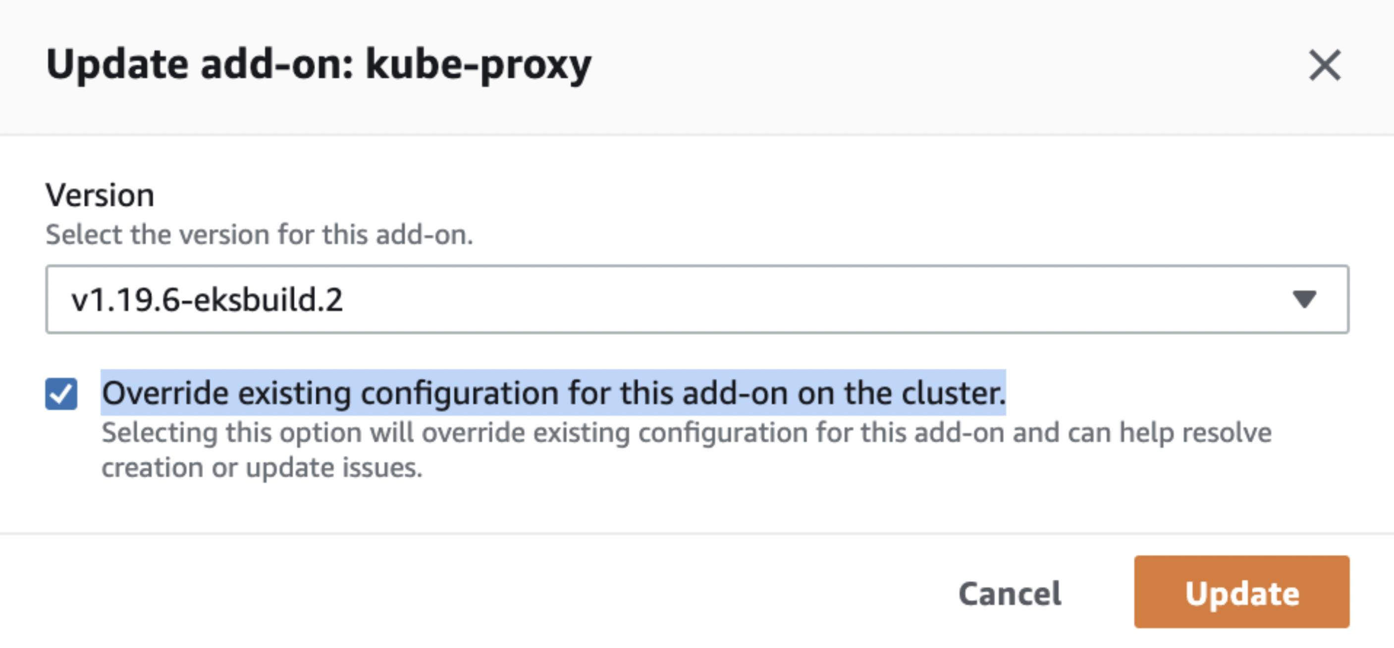 Upgrade to the newer version by specifying the version of an addon you want to upgrade. Amazon EKS also provides an override of the existing configuration checkbox which mitigates issues by discarding older add-on configuration in favor of the new add-on configuration.