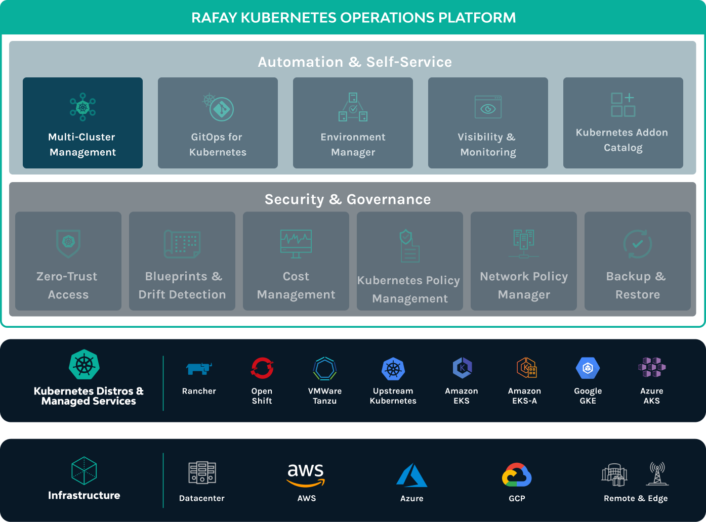 Rafay’s K8s Multi-Cluster Management Service provides lifecycle management and blueprinting support for managed Kubernetes services, such as Amazon EKS and Azure AKS, for packaged offerings such as RedHat OpenShift, and for upstream Kubernetes deployments. This service also incorporates logs/metrics collection, storage management, secrets management, and more.