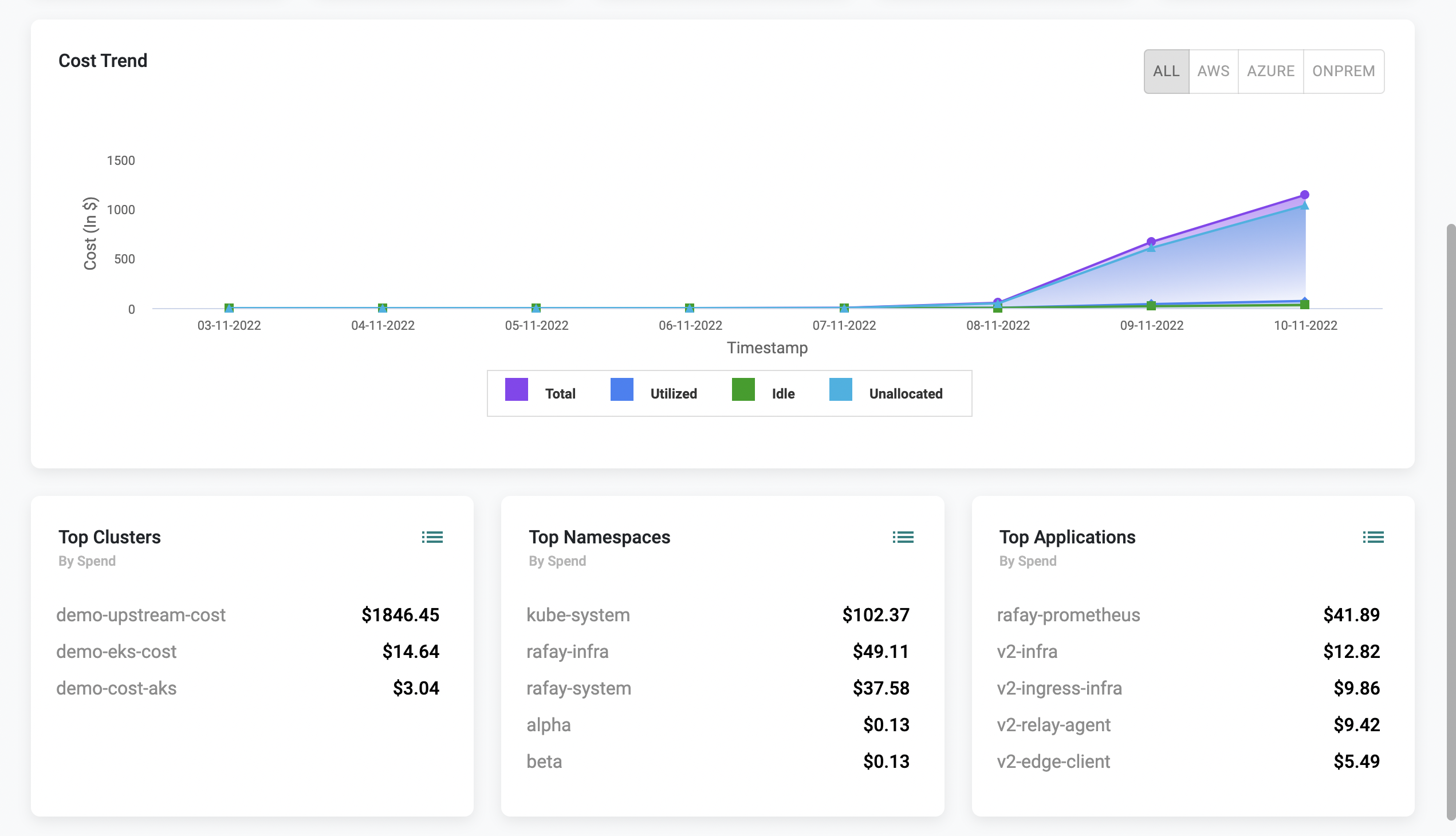 Rafay’s integrated platform makes it easy for teams to manage their Kubernetes cost from the same place they provision and secure their clusters.